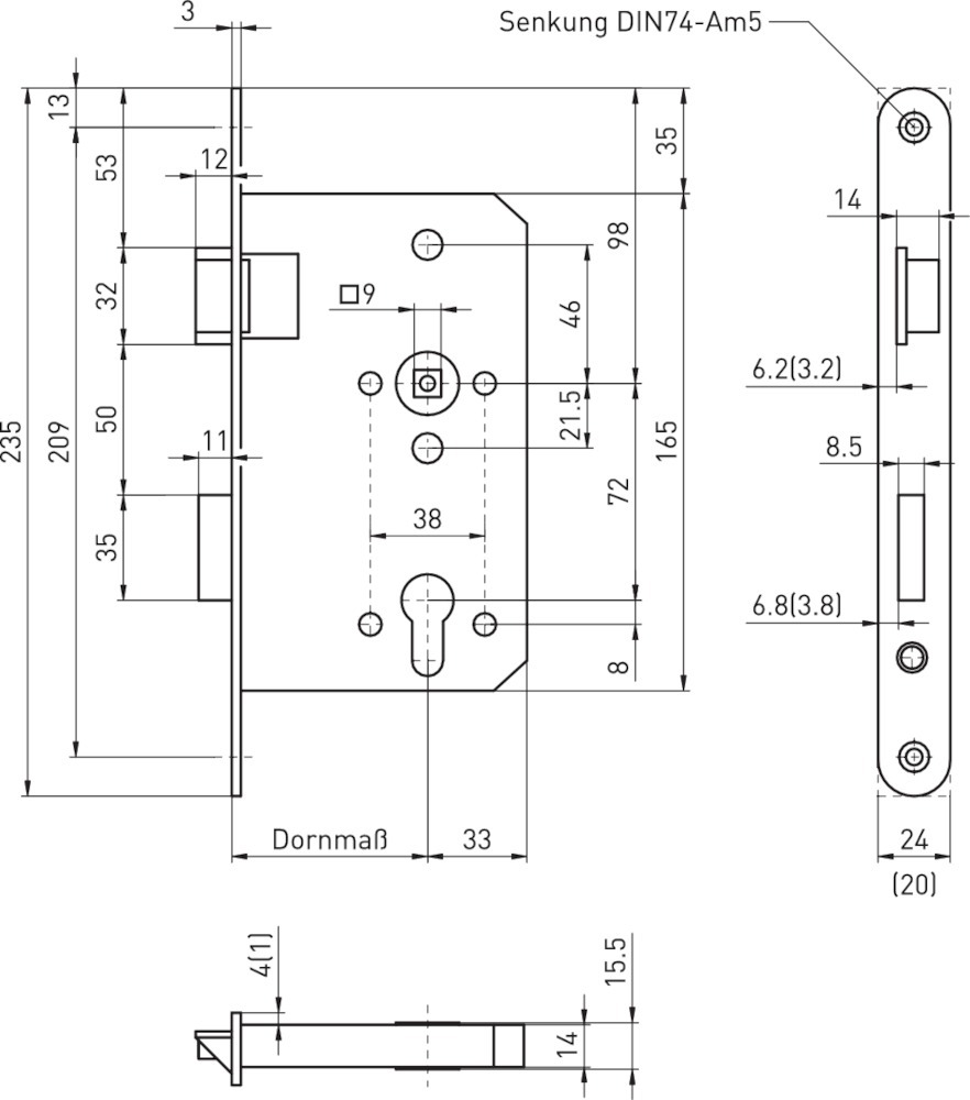 BMH FH Panik-Einsteckschloss für einflügelige Türe 1028 PZ, 9/72 mm, rund, Edelstahl