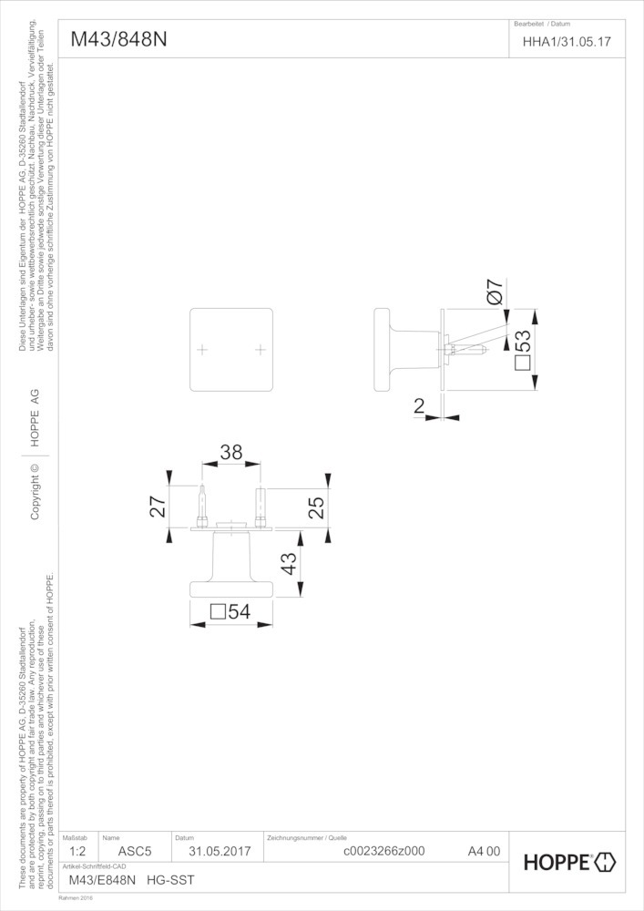 HOPPE Halbgarnitur M43/848N; Produkttyp: Halbgarnitur; Produkttyp (Hersteller): Halbgarnitur; Ausführung: ohne Schlüsselrosette; Befestigungsart Drückerrosette (außen): aufsteckbar; Befestigungstechnik: mit Stütznocken; Montageart: aufliegend; Form Drückerrosette: eckig; Vierkant: 8 mm; Material: Messing; Form Türgriff (außen): Flachknopf; Ausführung Türgriff (außen): fest; Gewinde Knopf/Griffplatte: M12; Breite Türgriff (außen): 54 mm; Länge Türgriff (außen): 54 mm; Höhe Türgriff (außen): 43 mm; Breite Drückerrosette (außen): 53 mm; Länge Drückerrosette (außen): 53 mm; Höhe Drückerrosette (außen): 2 mm; Einsatzbereich: Wohnungseingangstür,Haustür; Türart: Vollblatt; Türwerkstoff: Stahl,Holz; Anwendung: außen; DIN-Richtung: DIN Links-Rechts; Farbe: mehrfarbig; Farbton: satiniert vernickelt/edelstahl matt; Ausführung Vierkant: Rollenwechselstift; Türstärke min.: 35 mm; Türstärke max.: 45 mm