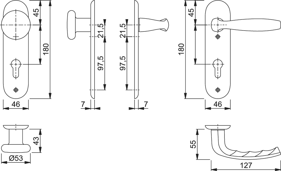 HOPPE Wechselgarnitur New York 53/273KP/1810; Produkttyp: Wechselgarnitur; Produkttyp (Hersteller): Wechselgarnitur; Ausführung: Kurzschild; Befestigungsart: sichtbar verschraubt; Befestigungstechnik: ohne Stütznocken; Form: oval; Vierkant: 8 mm; Material: Aluminium; Form Türgriff (innen): gebogen; Form Türgriff (außen): Flachknopf; Ausführung Türgriff (außen): fest; Gewinde Knopf/Griffplatte: M12; Durchmesser Türgriff (außen): 53 mm; Länge Türgriff (innen): 127 mm; Höhe Türgriff (innen): 55 mm; Höhe Türgriff (außen): 43 mm; Schildbreite außen: 46 mm; Schildbreite innen: 46 mm; Schildlänge außen: 180 mm; Schildlänge innen: 180 mm; Schildstärke außen: 9 mm; Schildstärke innen: 9 mm; Lagerung: wartungsfreies Gleitlager; Einsatzbereich: Wohnungseingangstür,Objekttür; Türart: Vollblatt; Türwerkstoff: Stahl,Holz; Norm: DIN EN 1906; Lochung: Profilzylinder gelocht; Entfernung: 72 mm; DIN-Richtung: DIN Links-Rechts; Farbe: silber; Farbton: naturfarben; Oberfläche: eloxiert; Ausführung Vierkant: Rollenwechselstift; Türstärke min.: 37 mm; Türstärke max.: 42 mm; EN 1906 - Gebrauchskategorie: Klasse 3; EN 1906 - Korrosionsbeständigkeit: Klasse 4; Klassifizierungsschlüssel EN 1906: 37-0140U