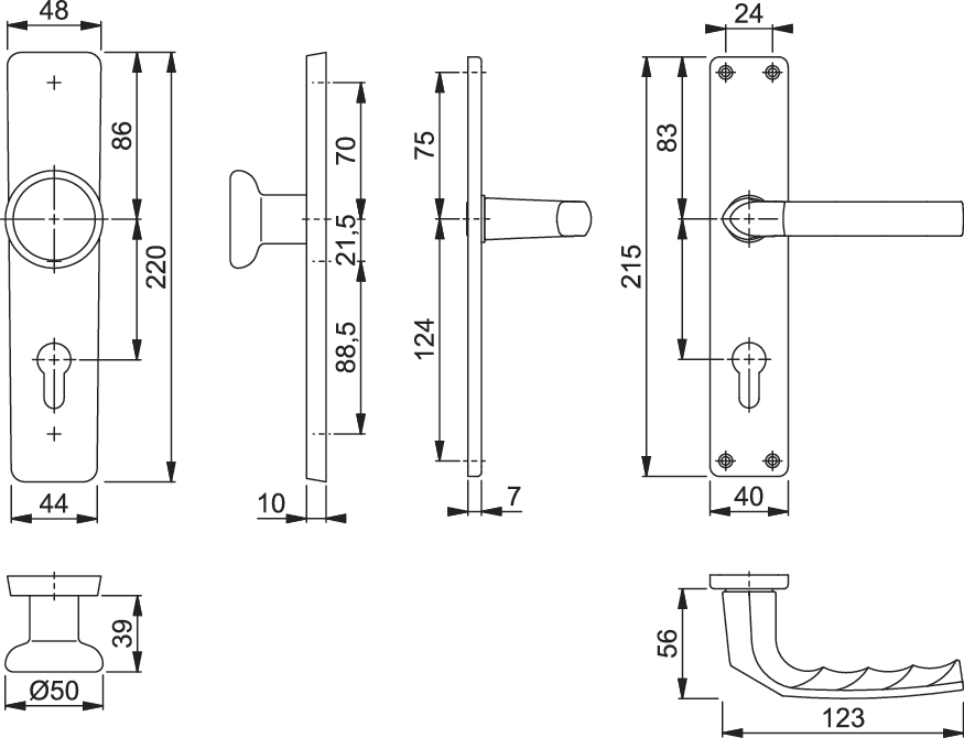 HOPPE Wechselgarnitur Birmingham 54/227/202SP/1117; Produkttyp: Wechselgarnitur; Produkttyp (Hersteller): Wechselgarnitur; Ausführung: Langschild; Befestigungsart: innen sichtbar verschraubt; Befestigungstechnik: ohne Stütznocken; Form: konisch; Vierkant: 8 mm; Material: Aluminium; Form Türgriff (innen): L-Form; Form Türgriff (außen): Flachknopf; Ausführung Türgriff (außen): fest; Gewinde Knopf/Griffplatte: M12; Durchmesser Türgriff (außen): 50 mm; Länge Türgriff (innen): 123 mm; Höhe Türgriff (innen): 56 mm; Höhe Türgriff (außen): 39 mm; Schildbreite außen: 48 mm; Schildbreite innen: 40 mm; Schildlänge außen: 220 mm; Schildlänge innen: 215 mm; Schildstärke außen: 10 mm; Schildstärke innen: 7 mm; Lagerung: wartungsfreies Gleitlager; Einsatzbereich: Objekttür,Wohnungseingangstür; Türart: Vollblatt; Türwerkstoff: Stahl,Holz; Lochung: Profilzylinder gelocht; Entfernung: 72 mm; DIN-Richtung: DIN Links-Rechts; Farbe: silber; Farbton: neusilberfarben; Oberfläche: eloxiert; Ausführung Vierkant: Rollenwechselstift; Türstärke min.: 37 mm; Türstärke max.: 42 mm