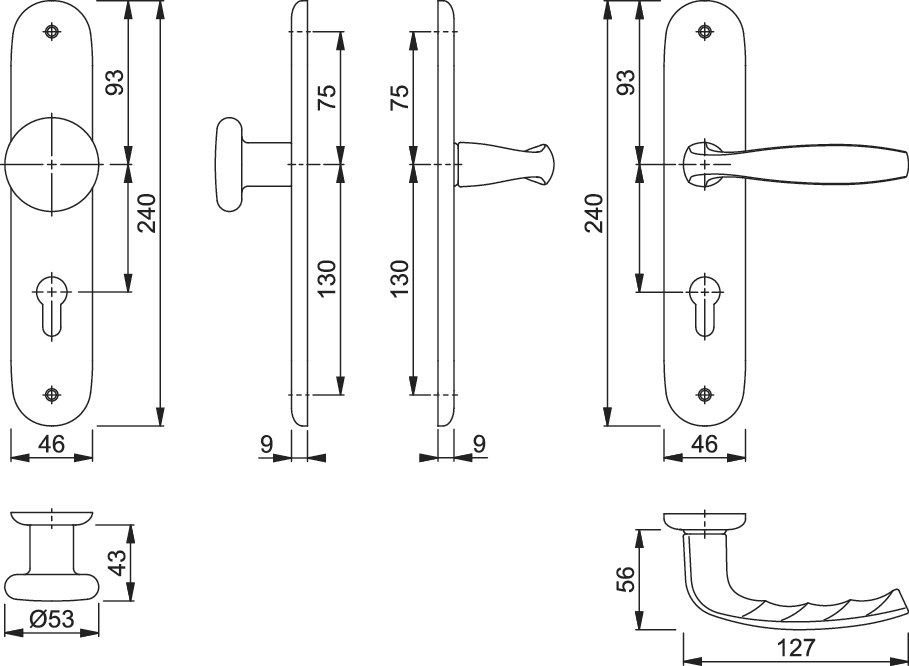 HOPPE Wechselgarnitur New York 53/273P/1810; Produkttyp: Wechselgarnitur; Produkttyp (Hersteller): Wechselgarnitur; Ausführung: Langschild; Befestigungsart: sichtbar verschraubt; Befestigungstechnik: ohne Stütznocken; Form: oval; Vierkant: 8 mm; Material: Aluminium; Form Türgriff (innen): gebogen; Form Türgriff (außen): Flachknopf; Ausführung Türgriff (außen): fest; Gewinde Knopf/Griffplatte: M12; Durchmesser Türgriff (außen): 53 mm; Länge Türgriff (innen): 127 mm; Höhe Türgriff (innen): 56 mm; Höhe Türgriff (außen): 43 mm; Schildbreite außen: 46 mm; Schildbreite innen: 46 mm; Schildlänge außen: 240 mm; Schildlänge innen: 240 mm; Schildstärke außen: 9 mm; Schildstärke innen: 9 mm; Lagerung: mit Rückholfeder,wartungsfreies Gleitlager; Einsatzbereich: Wohnungseingangstür,Objekttür; Türart: Vollblatt; Türwerkstoff: Holz,Stahl; Norm: DIN EN 1906; Lochung: Profilzylinder gelocht; Entfernung: 72 mm; DIN-Richtung: DIN Links-Rechts; Farbe: silber; Farbton: naturfarben; Oberfläche: eloxiert; Ausführung Vierkant: Rollenwechselstift; Türstärke min.: 37 mm; Türstärke max.: 42 mm; EN 1906 - Gebrauchskategorie: Klasse 3; EN 1906 - Korrosionsbeständigkeit: Klasse 4; Klassifizierungsschlüssel EN 1906: 37-0140A